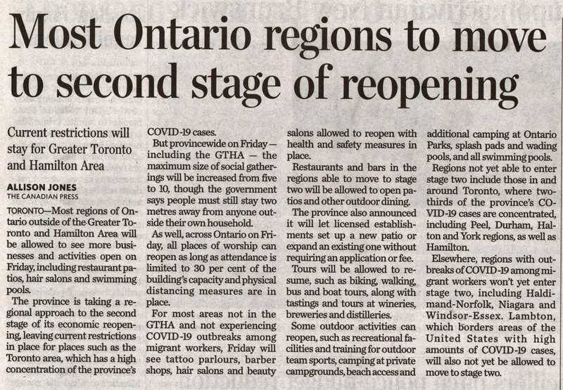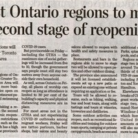 - Most Ontario regions to move to second stage of reopenng : Current restrictions will stay for Greater Toronto and Hamilton Area