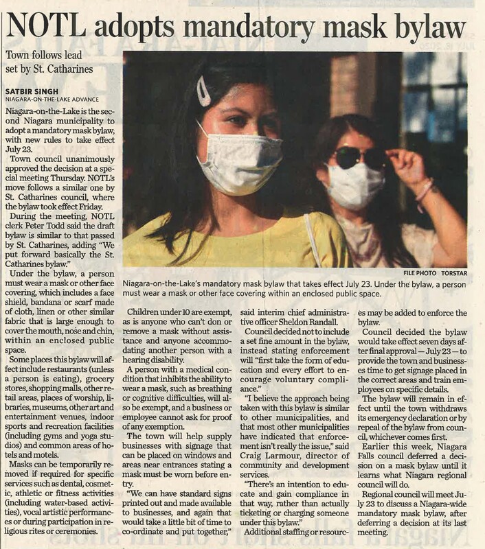 - NOTL adopts mandatory mask bylaw : town follows lead set by St. Catharines
