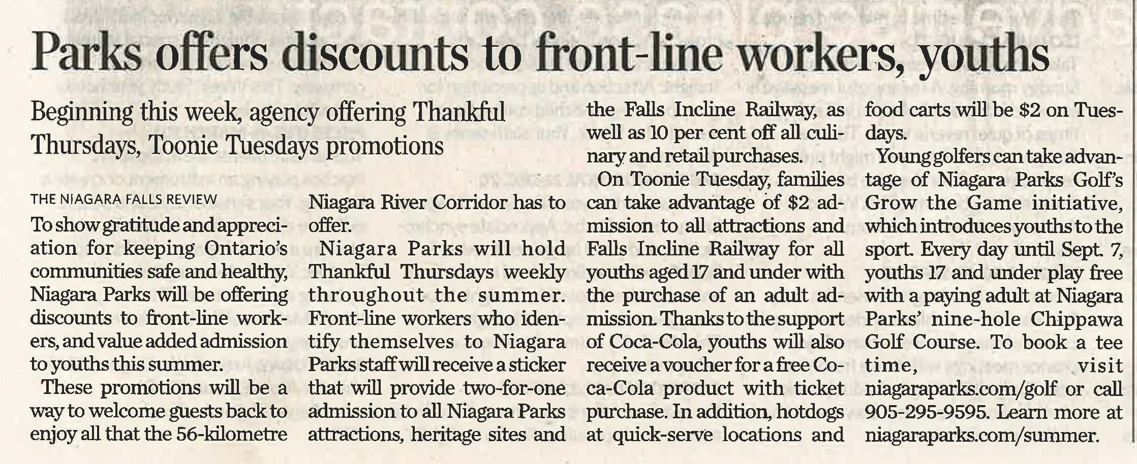 - Parks offers discounts to front-line workers, youths : beginning this week, agency offering Thankful Thursdays, Toonie Tuesdays promotions