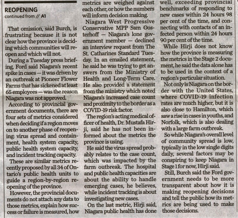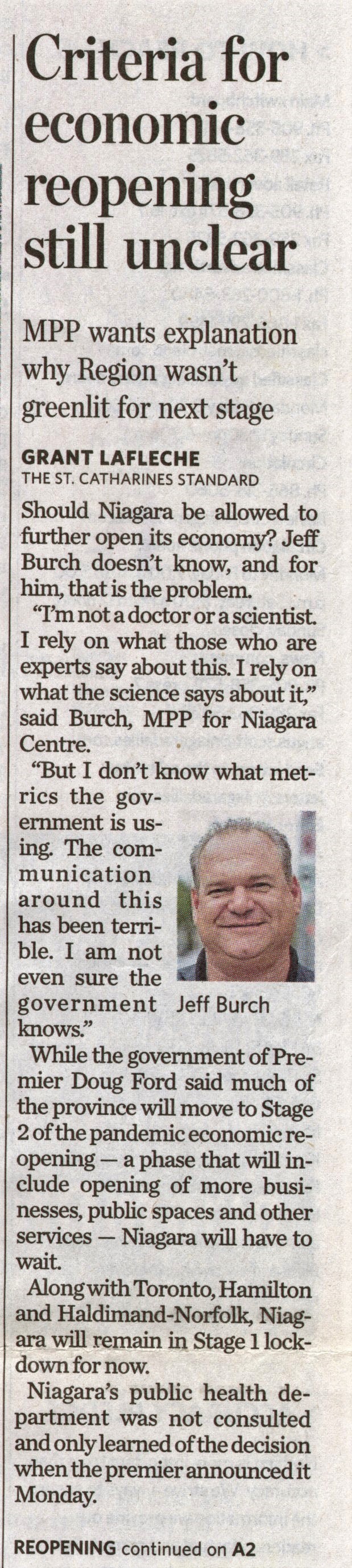 - Criteria for economic reopening still unclear : MPP wants explanation why Region wasn't greenlit for next stage