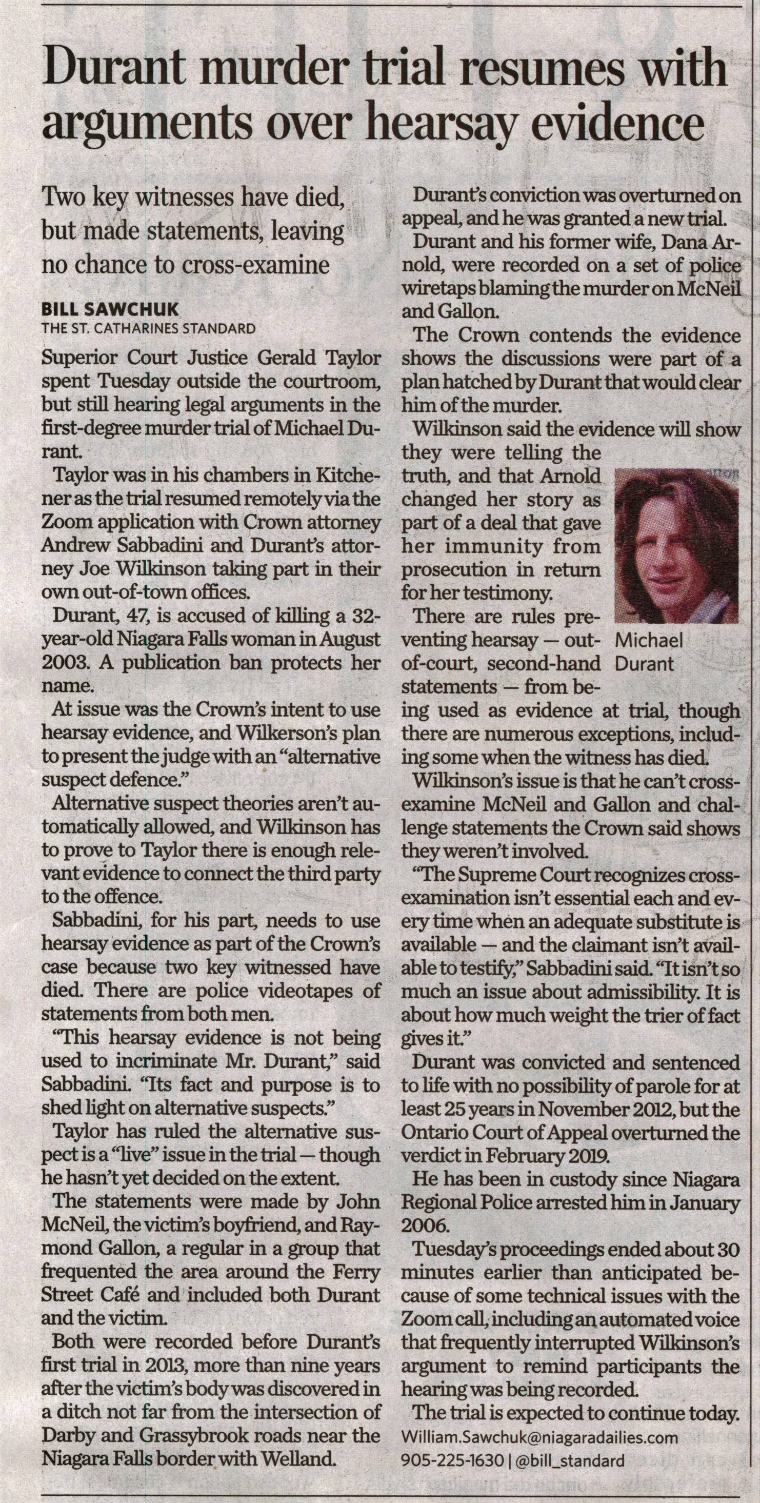 - Durant murder trial resumes with arguments over hearsay evidence : Two key witnesses have died but made statements, leaving no chance to cross-examine