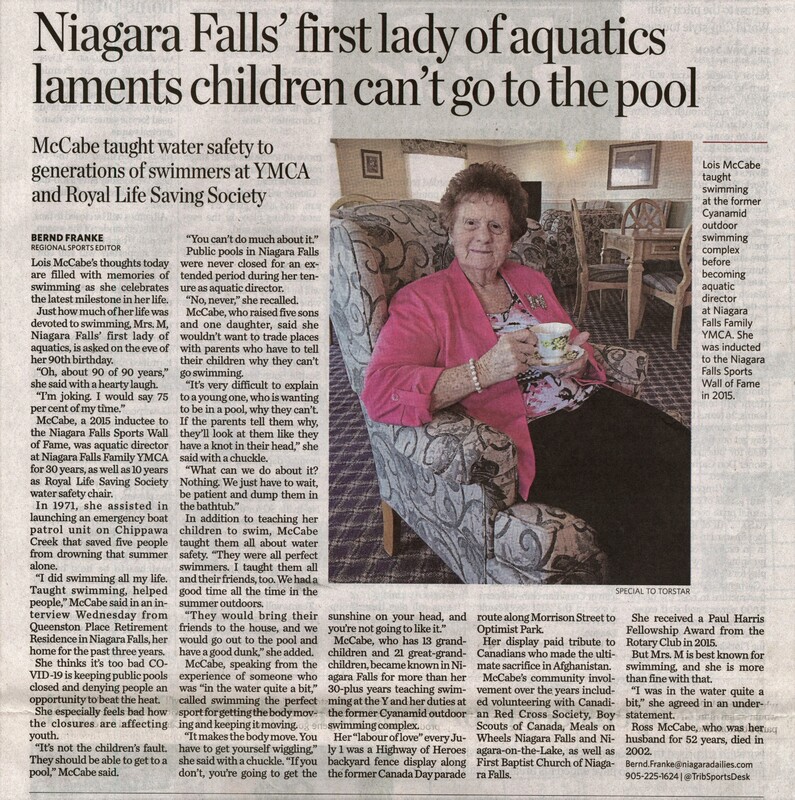 - Niagara Falls' first lady of aquatics laments children can't go to the pool : McCabe taught water safety to generations of swimmers at YMCA and Royal Life Saving Society