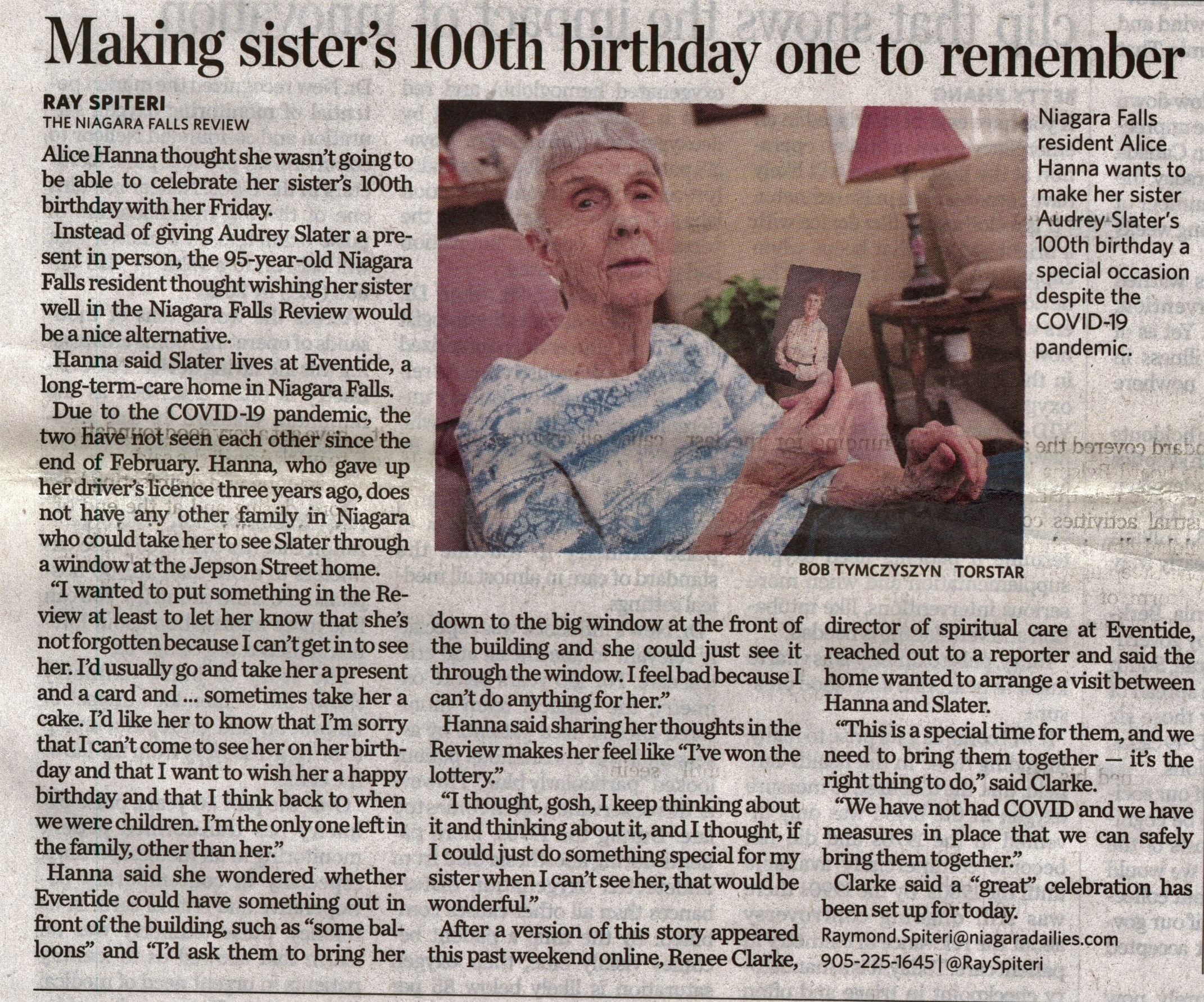 - Slater, Audrey / Hanna, Alice / 100th birthday / COVID-19 pandemic / Eventide / Clarke, Renee