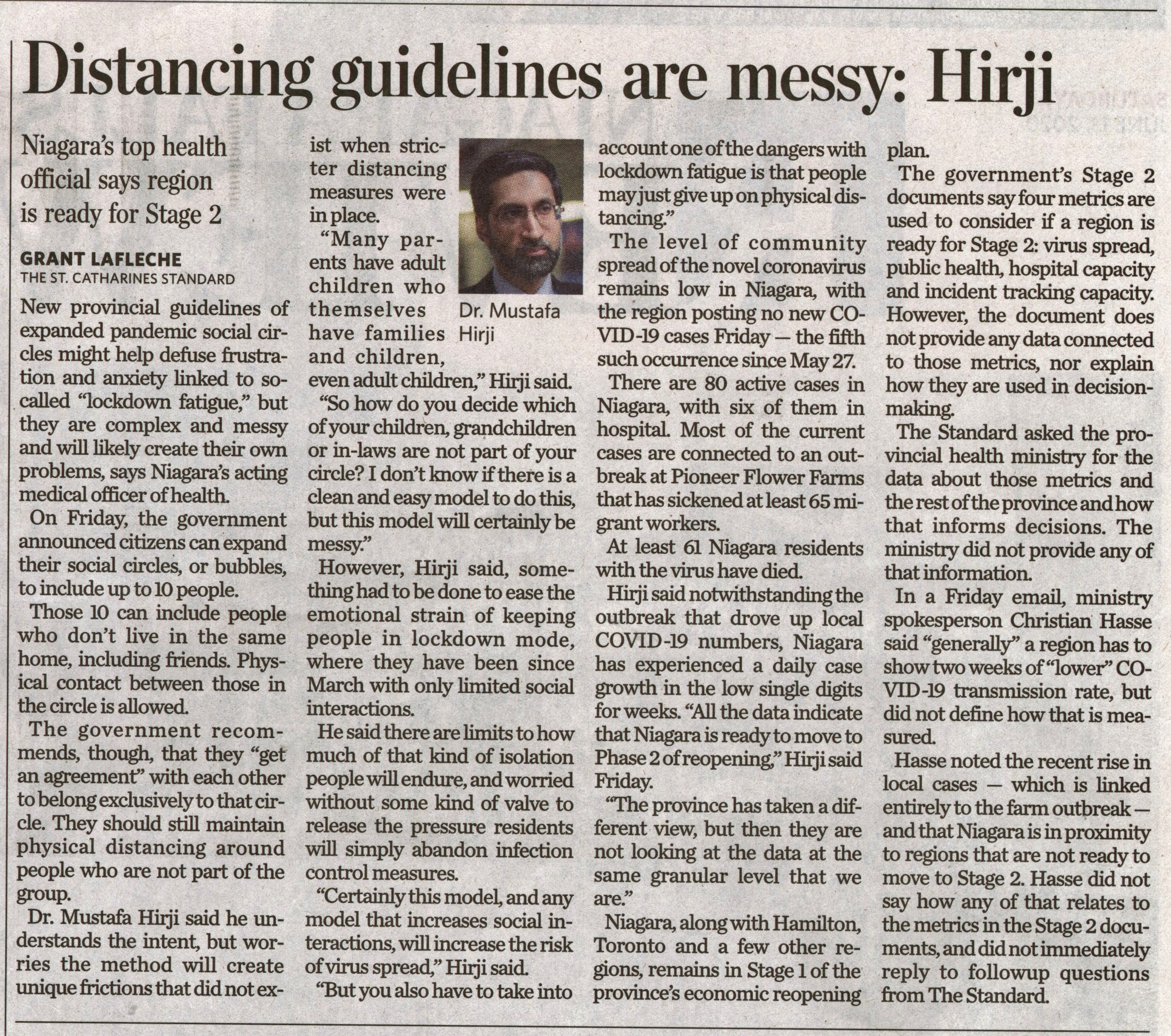 - Distancing guidlines are messy: Hirji : Niagara's top health official says region is ready for Stage 2