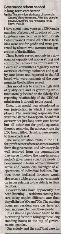 - Governance reform needed in long-term care sector Re: The army found a house of horrors in Ontario's long-term care. After two years in power, Doug Ford had no excuse not to know, May 26