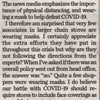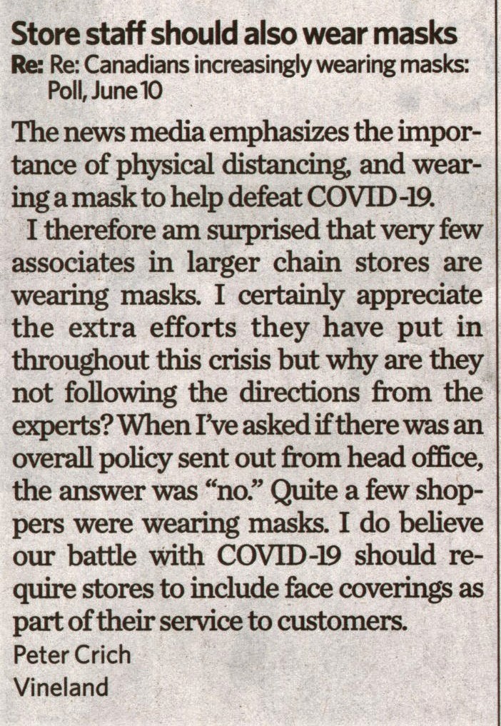 - Store staff should also wear masks : Re : Canadians increasingly wearing masks; Poll, June 10