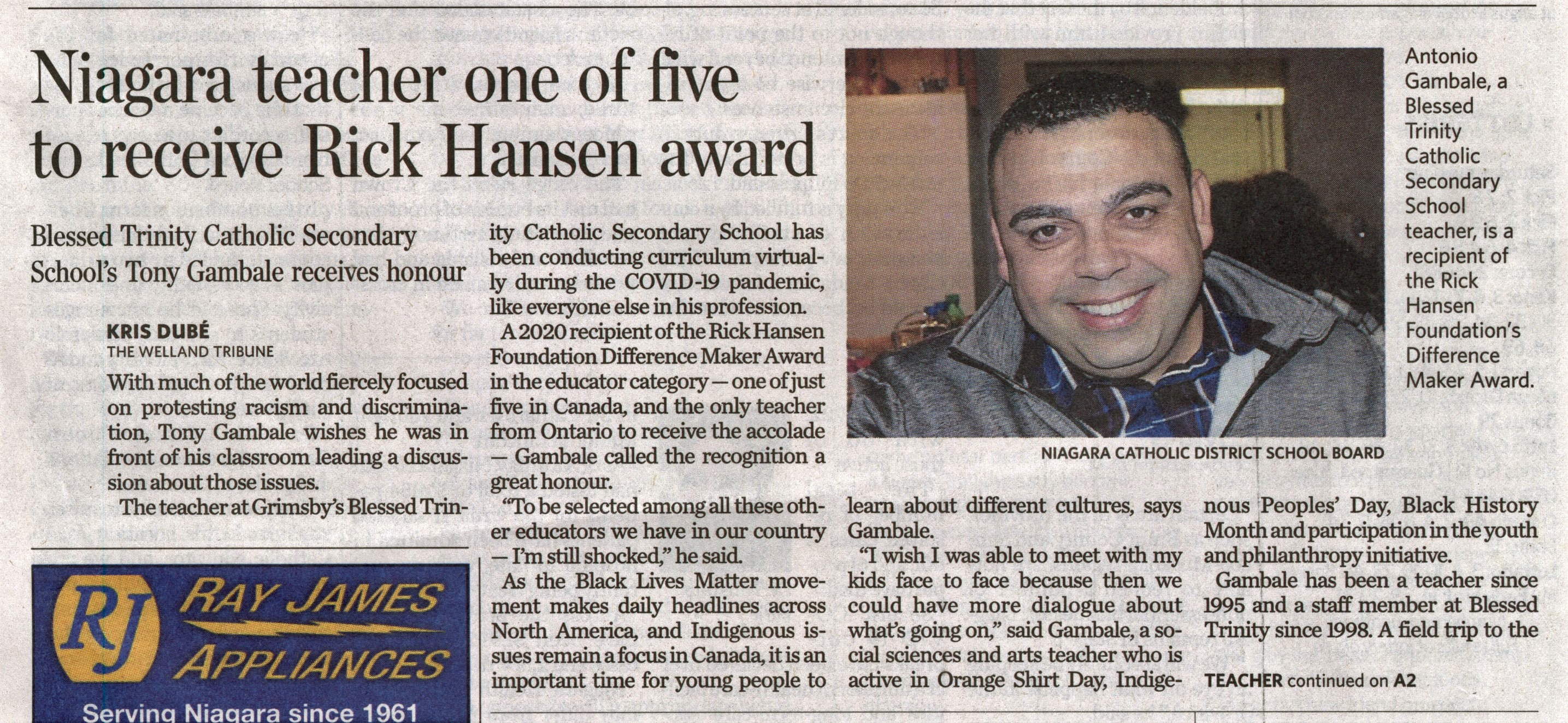 - Niagara teacher one of five to receive Rick Hansen award : Blessed Trinity Catholic Secondary School's Tony Gambale receives honour