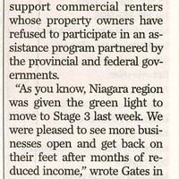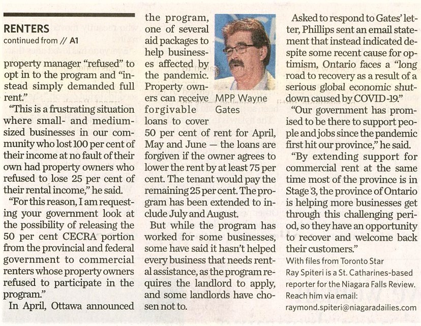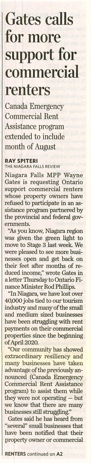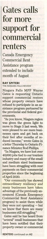 Gates, Wayne / Niagara Falls MPP / Niagara region / stage 3 / COVID-19 pandemic / small businesses / tourism industry