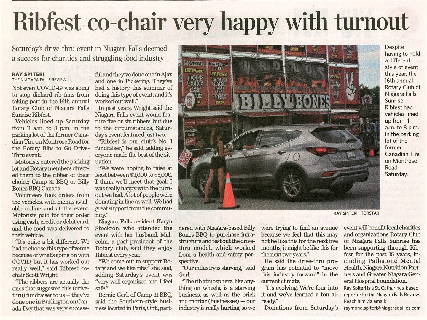 - Ribfest co-chair very happy with turnout : Saturday's drive-thru event in Niagara Falls deemed a success for charities and struggling food industry