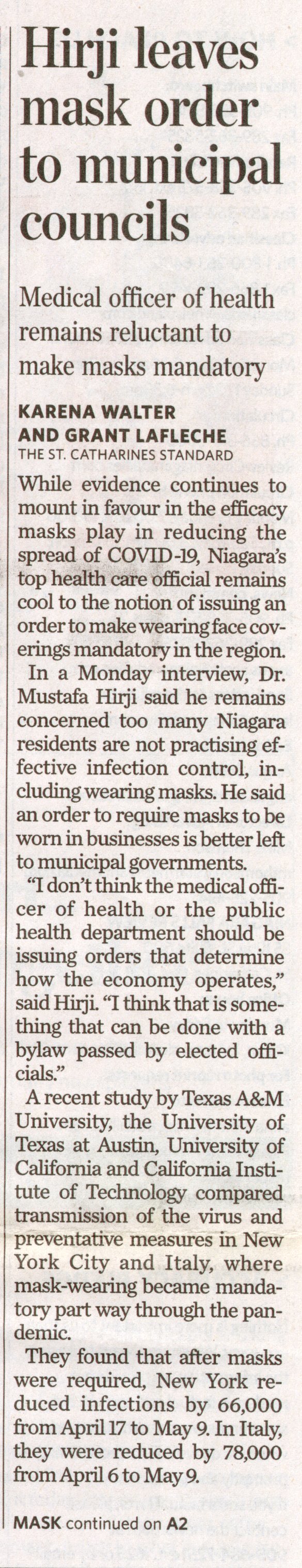 - Hirji leaves mask order to municipal councils : Medical officer of health remains reluctant to make masks mandatory