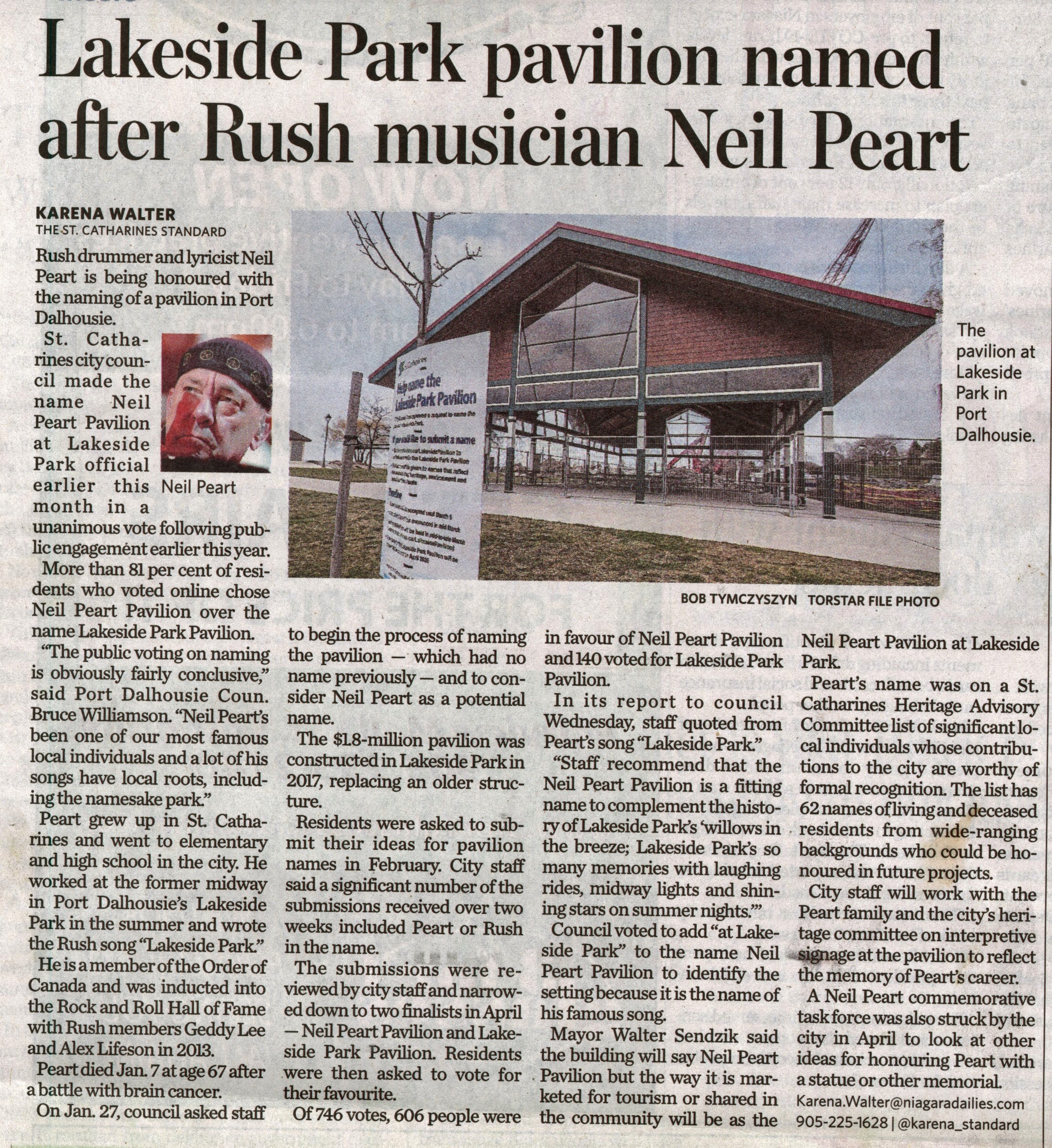 - Lakeside Park pavillion named after Rush musician Neil Peart