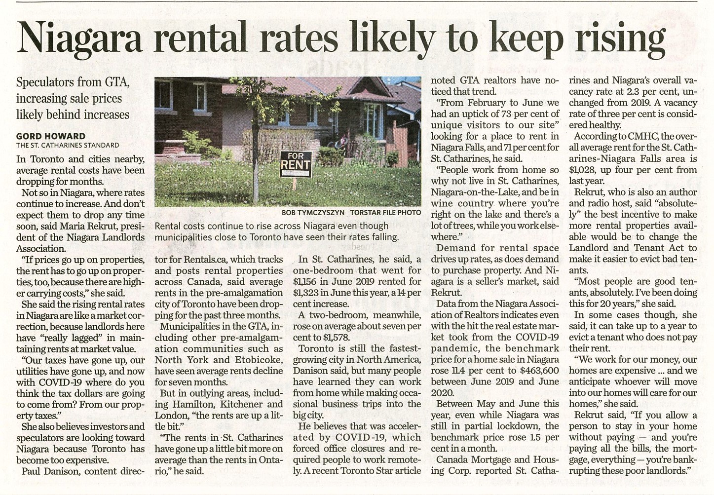 - Niagara rental rates likely to keep rising : Speculators from GTA, increasing sale prices likely behind increases