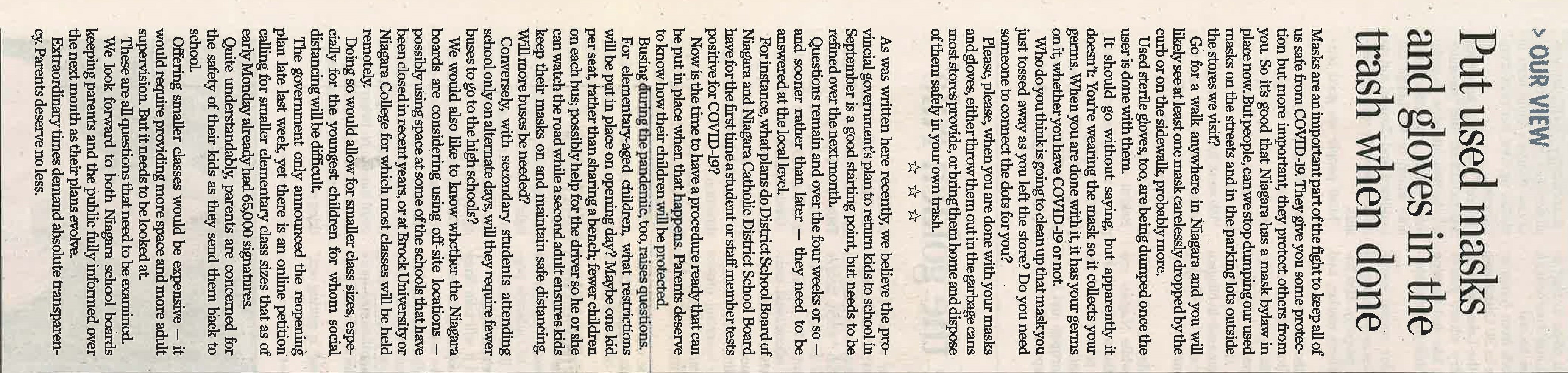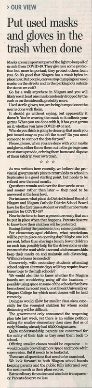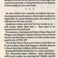 - COVID-19 pandemic / mask bylaw / trash / District School Board of Niagara / Niagara Catholic District School Board / student procedure / restrictions