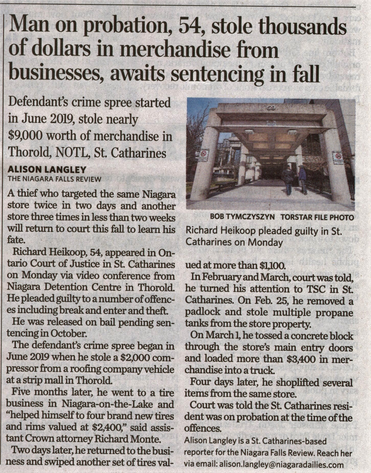 - Man on probation, 54, stole thousands of dollars in merchandise from businesses, awaits sentencing in fall : Defendant's crime spree started in June 2019, stole nearly $9,000 worth of merchandise in Thorold, NOTL, St. Catharines