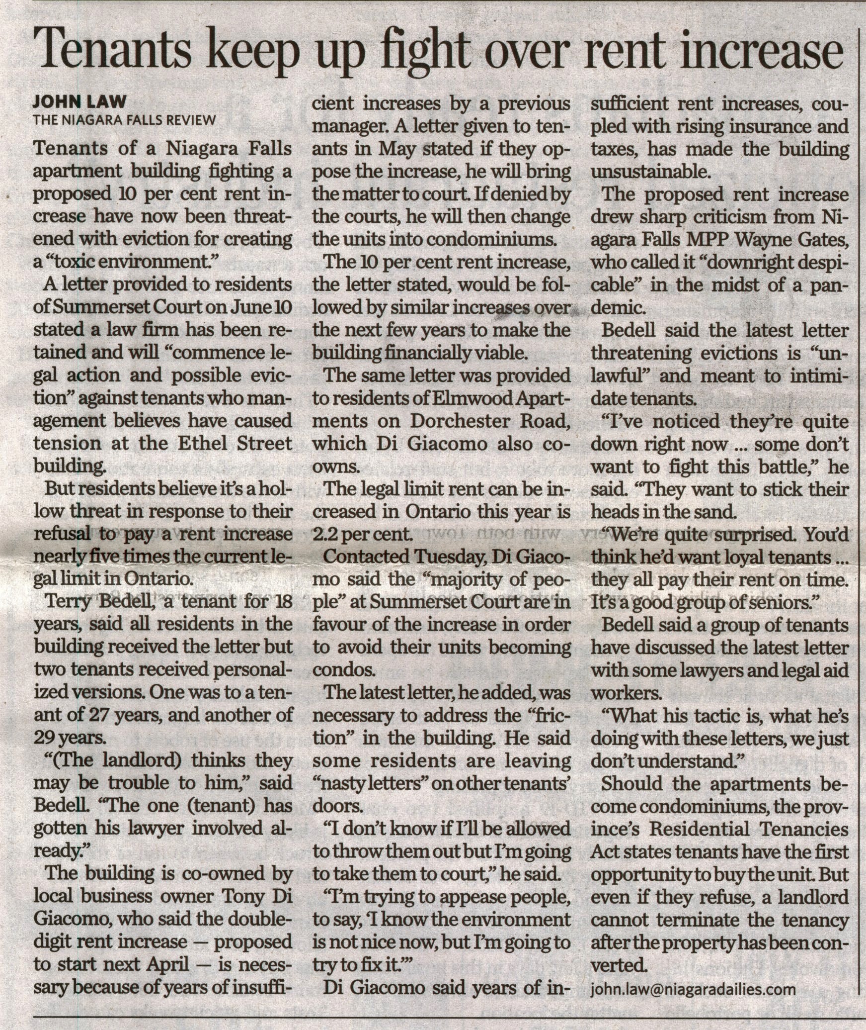 - Summerset Court / Tenant rent increase / Di Giacomo, Tony / Gates, Wayne / Bedell, Terry / legal action