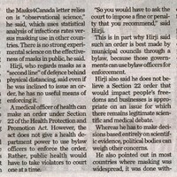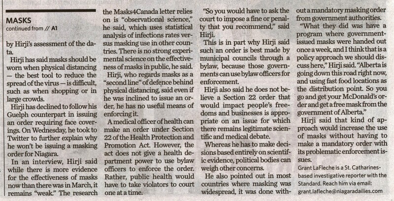 - Ali, Karim Dr. / COVID-19 pandemic / mandatory masks undecided / Niagara Health / Hirji, Mustafa Dr.
