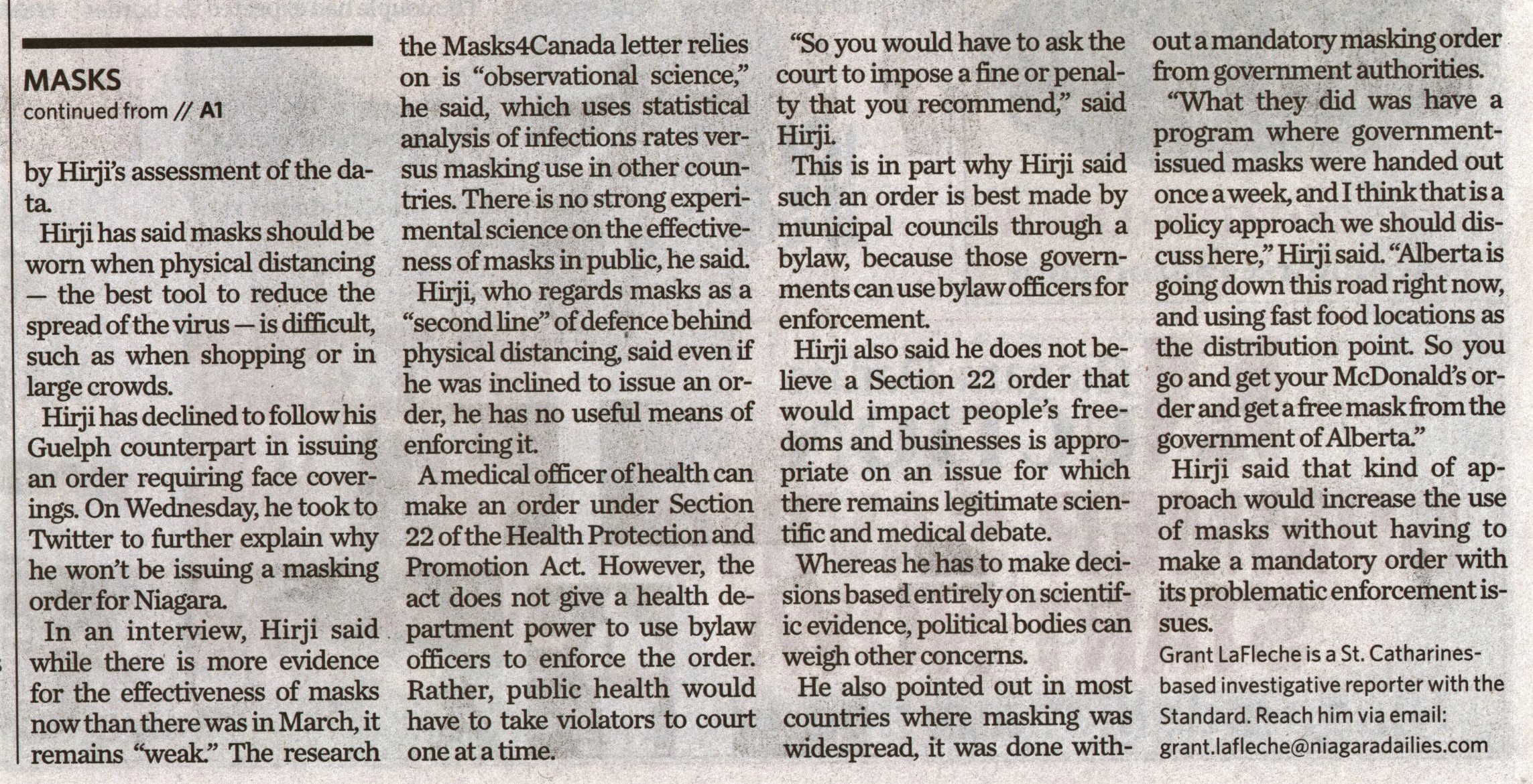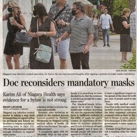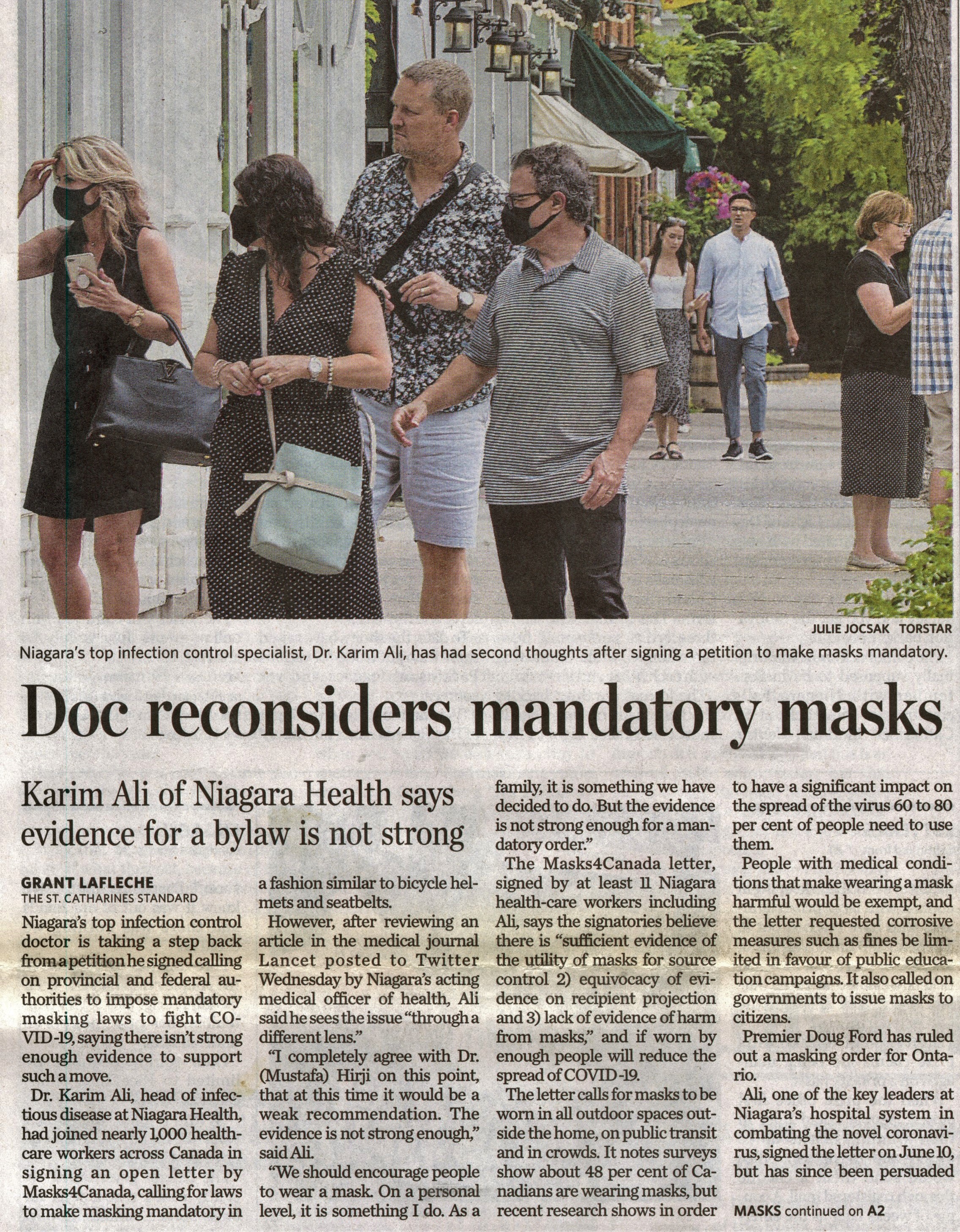 - Doc reconsiders mandatory masks : Karim Ali of Niagara Health says evidence for a bylaw is not strong