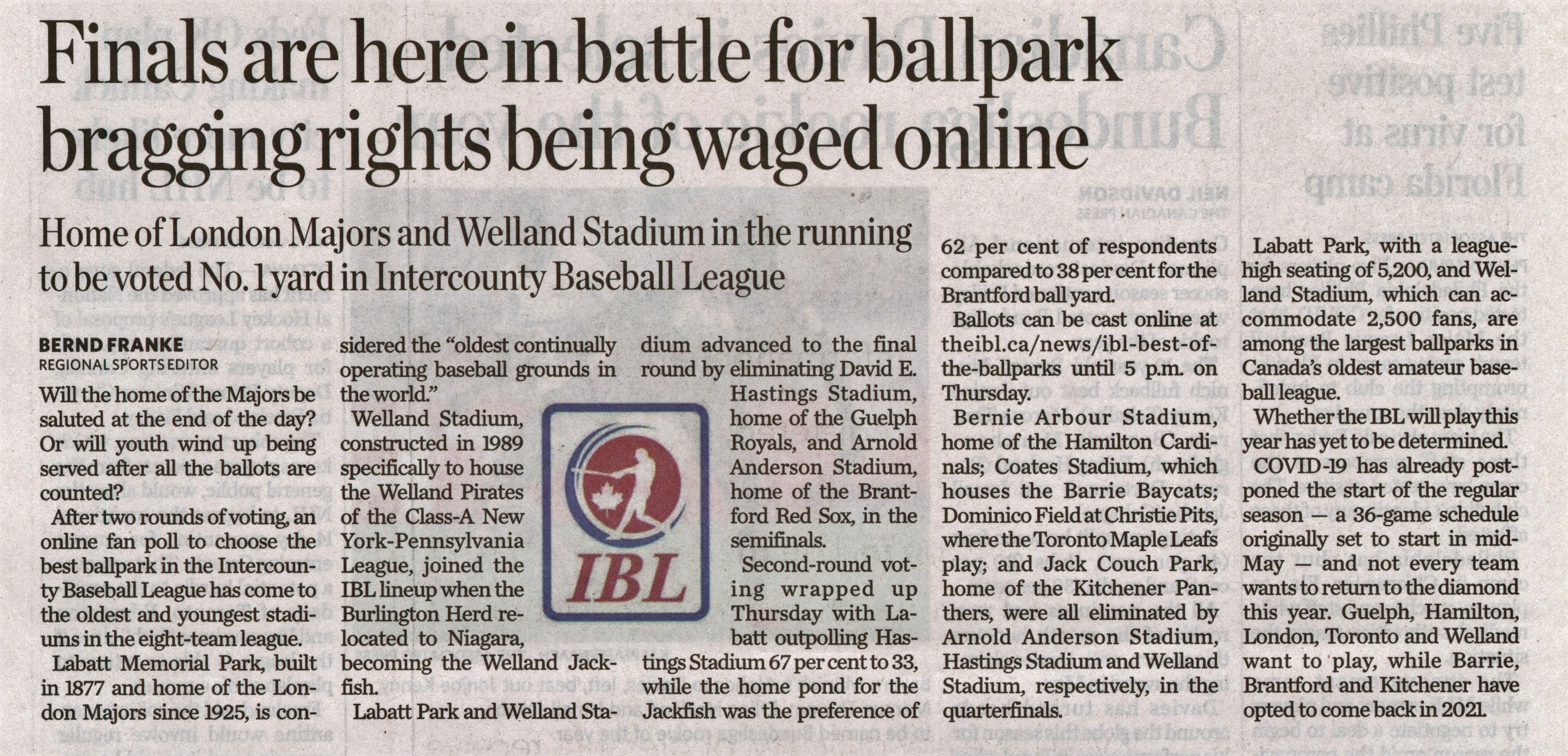 - Finals are here in battle for ballpark bragging rights being waged online : Home of London Majors and Welland Stadium in the running to be voted No. 1 yard in Intercounty Baseball League