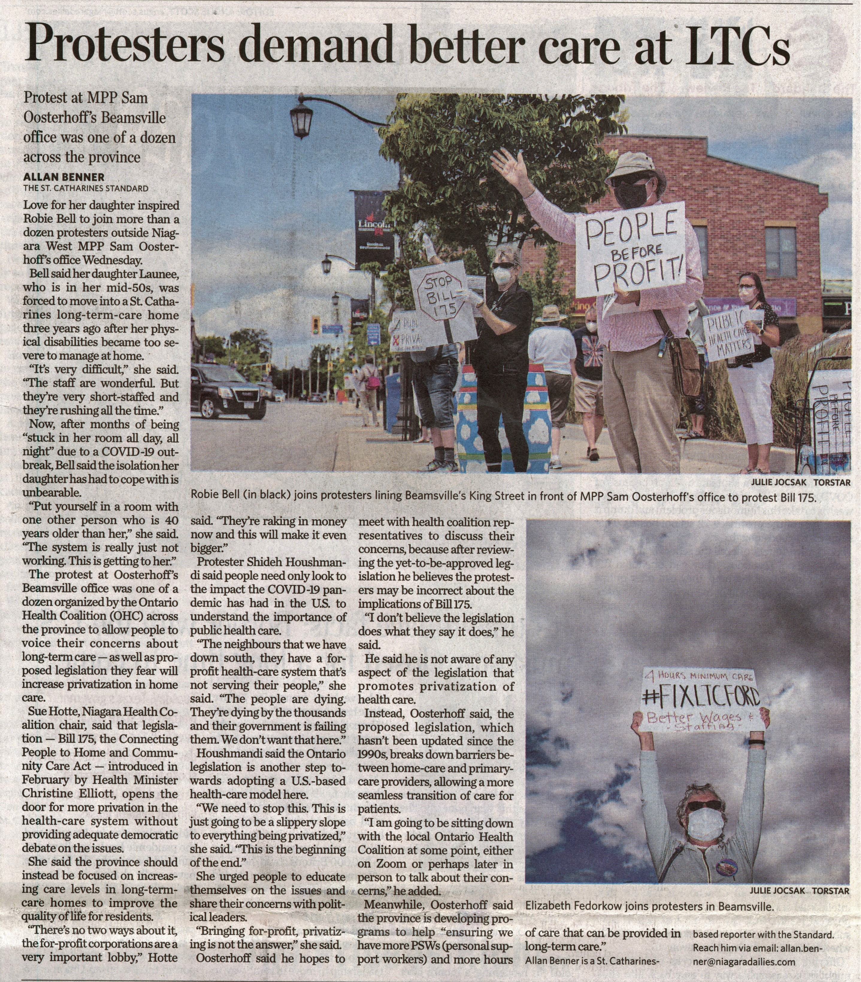 - Protesters demand better care at LTC's : Protest at MPP Sam Oosterhoff's Beamsville office was one of a dozen across the province