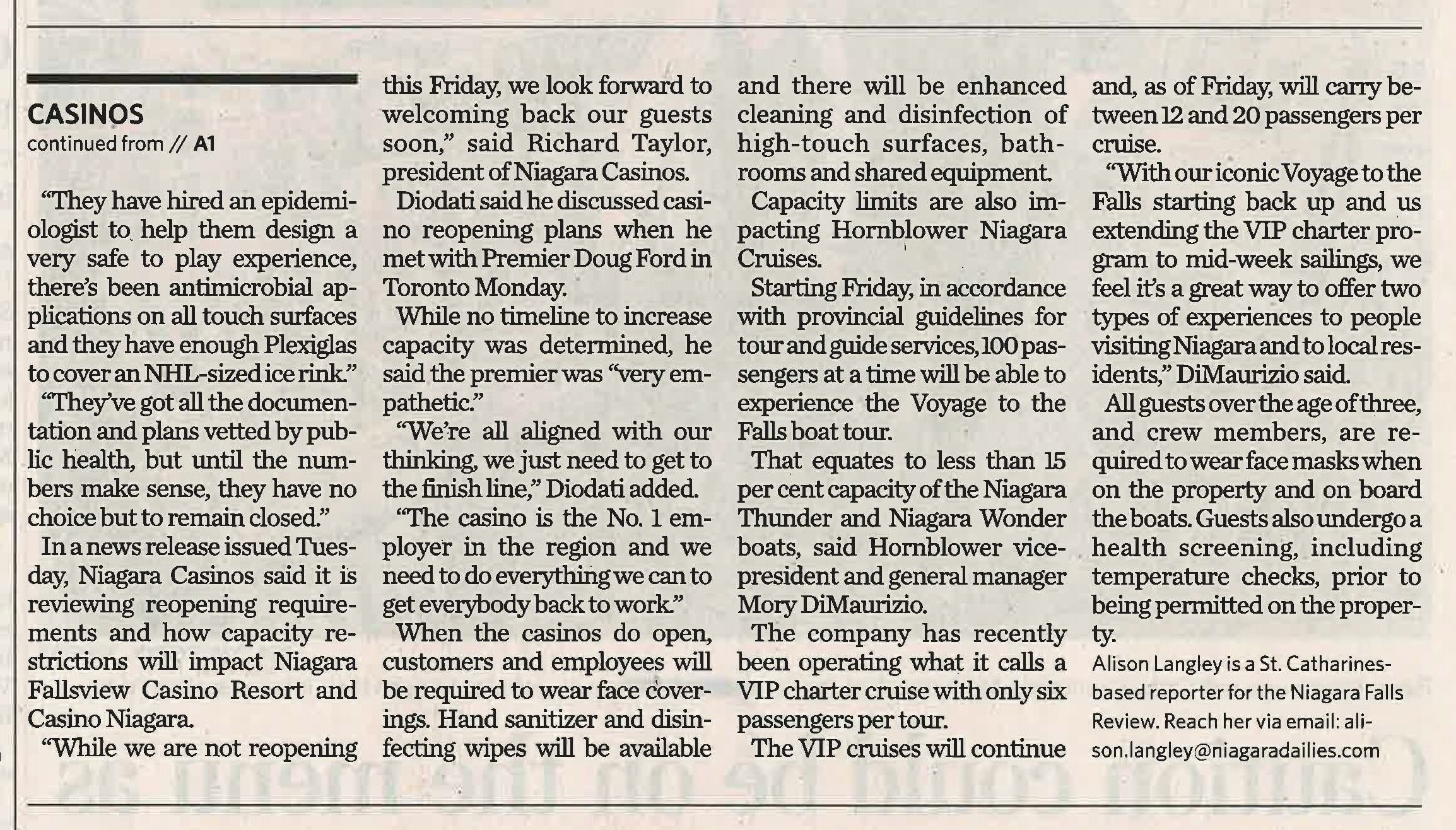 - Niagara Falls casinos will not reopen under current limits : it's not worth opening the doors due to attendance cap, says mayor