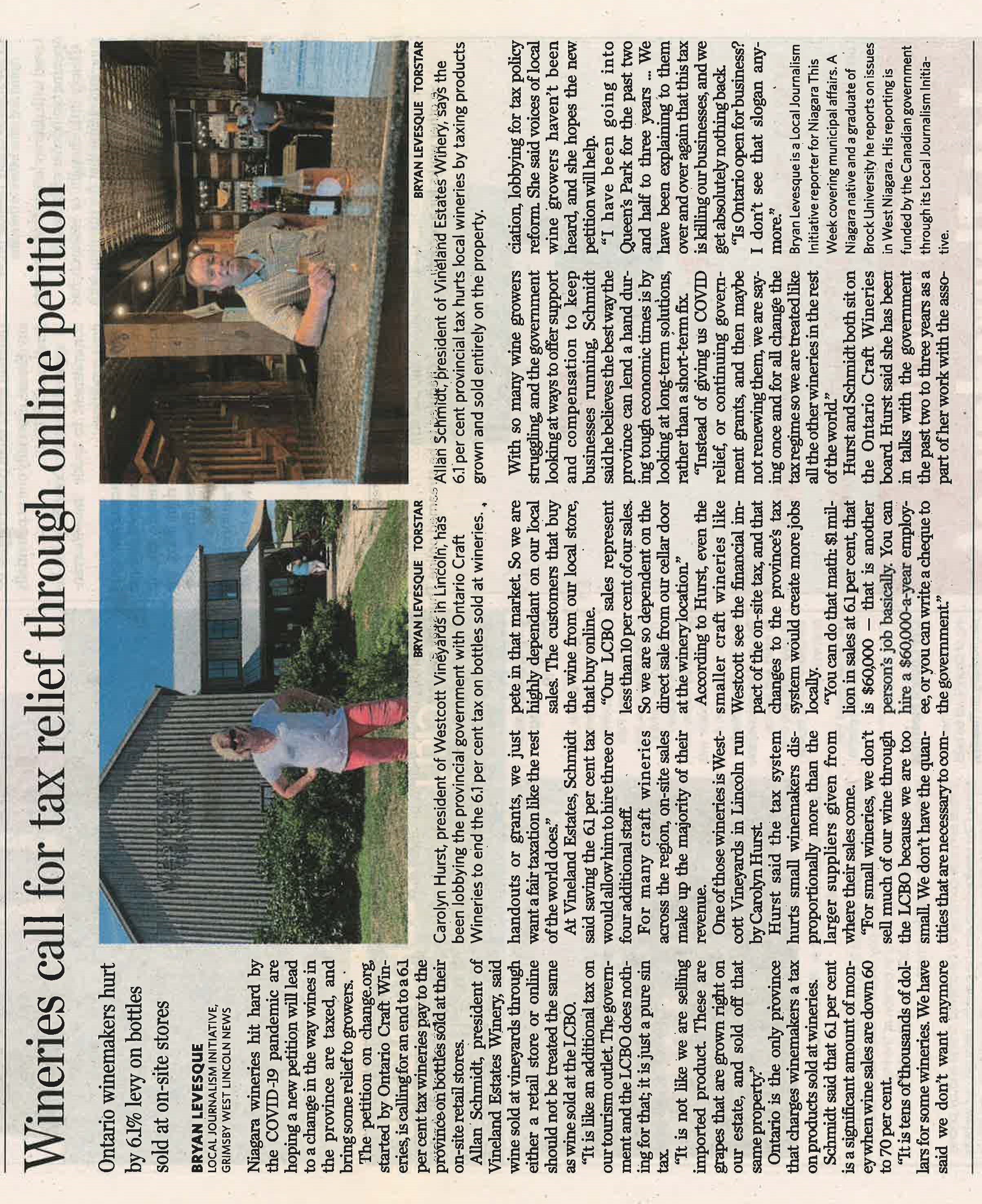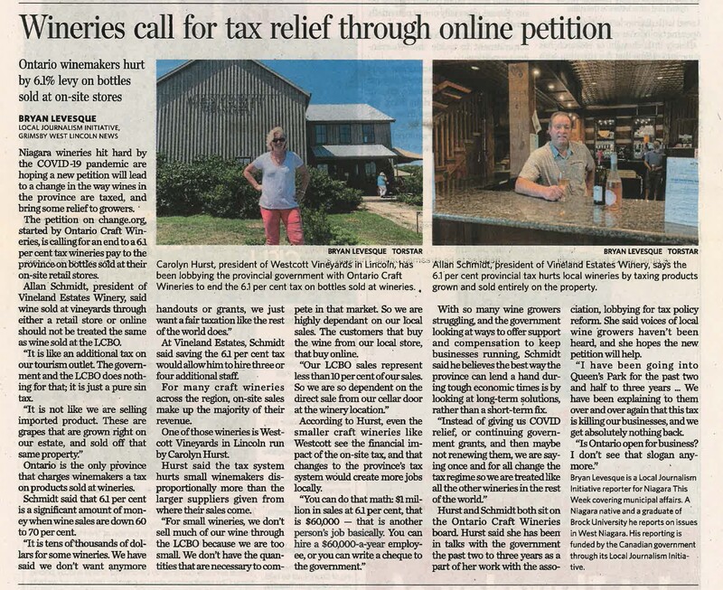 - Hurst, Carolyn / Westcott Vineyards / Schmidt, Allan / Vineland Estate Winery / COVID-19 pandemic / Ontario Craft Wineries / LCBO / taxation