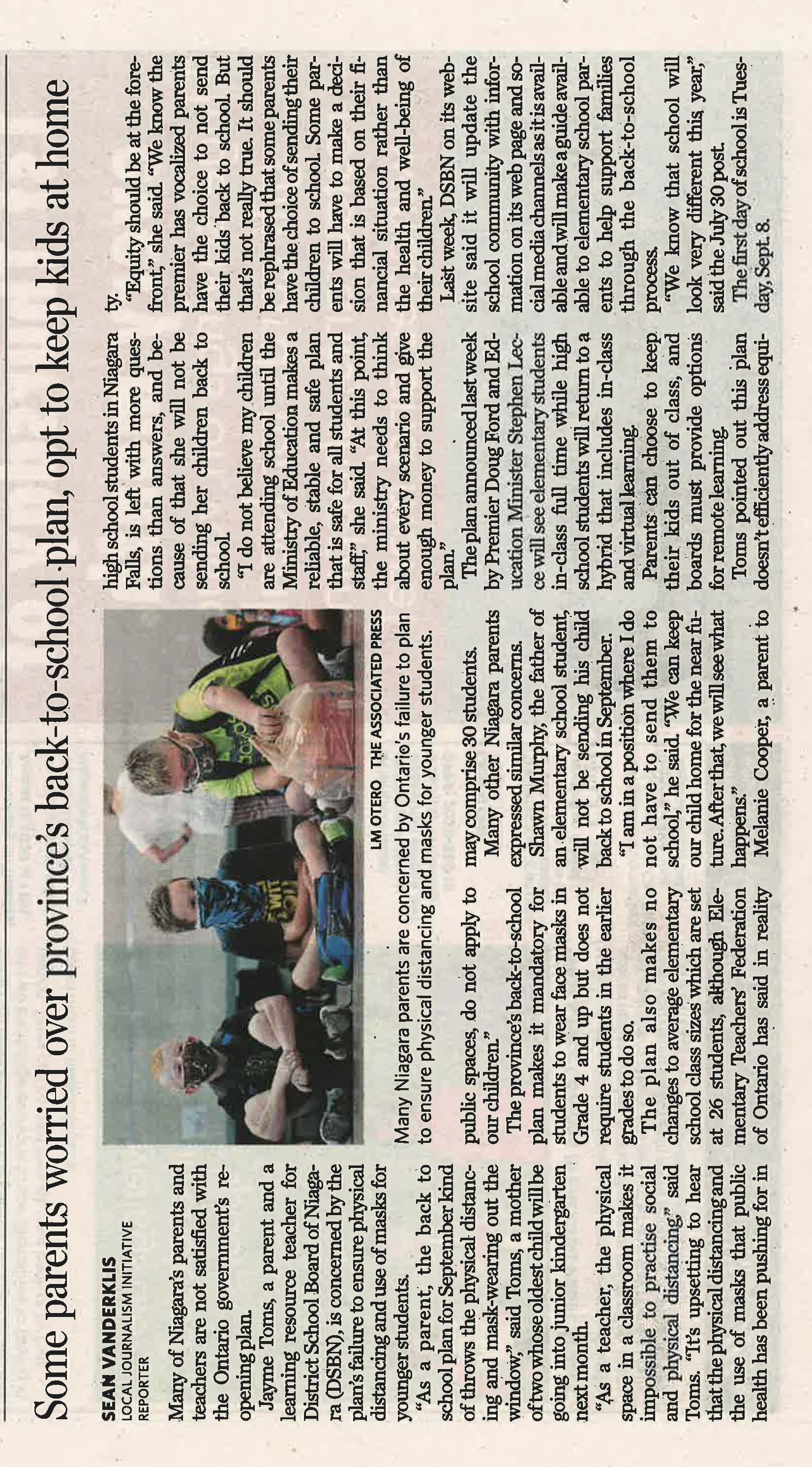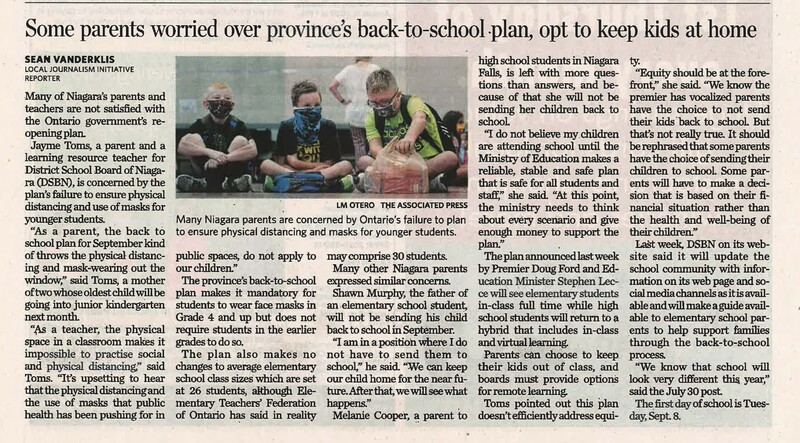 - Toms, Jayme / District School Board of Niagara / Niagara parents / physical distancing / mask / COVID-19 pandemic / Murphy, Shawn / Ministry of Education