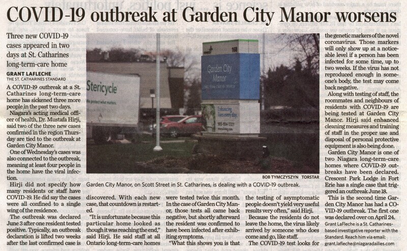 - COVID-19 outbreak at Garden City Manor worsens : Three new COVID-19 cases appeared in two days at St. Catharies long-term-care home