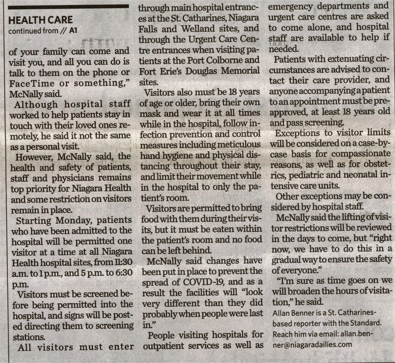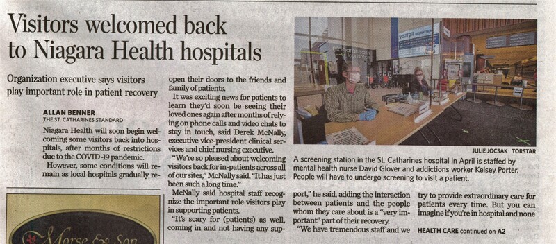 - Visitors welcomed back to Niagara Health hospitals : Organization executive says visitors play important role in patient recovery
