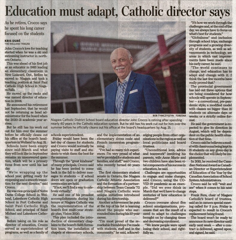 - Crocco, John / Niagara Catholic District School Board / Vision 2020 / COVID-19 pandemic / retirement