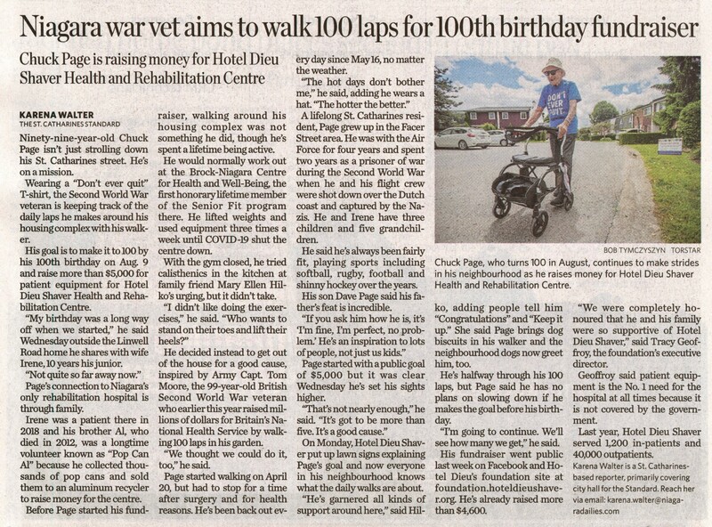 - Niagara war vet aims to walk 100 laps for 100th birthday fundraiser : Chuck Page is raising money for Hotel Dieu Shaver Health and Rehabilitation Centre
