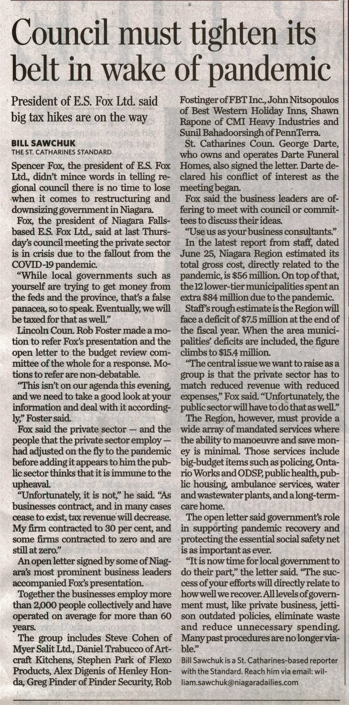 Council must tighten its belt in wake of pandemic : President of E.S. Fox Ltd. said big tax hikes are on the way