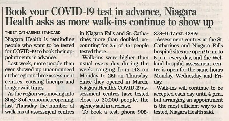 - Book your COVID-19 test in advance, Niagara Health asks as more walk-ins continue to show up