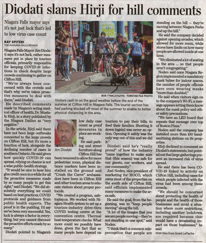 Diodati slams Hirji for hill comments : Niagara Falls mayor says it's not just luck that's led to low virus case counts