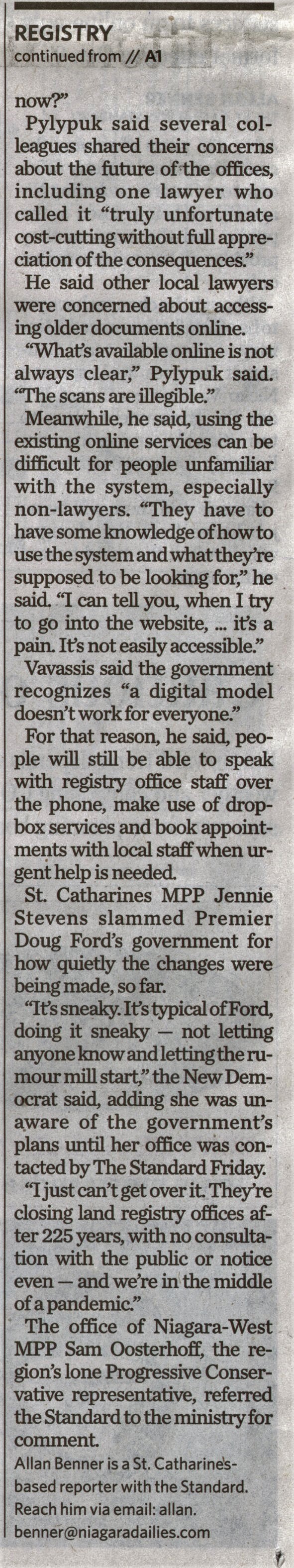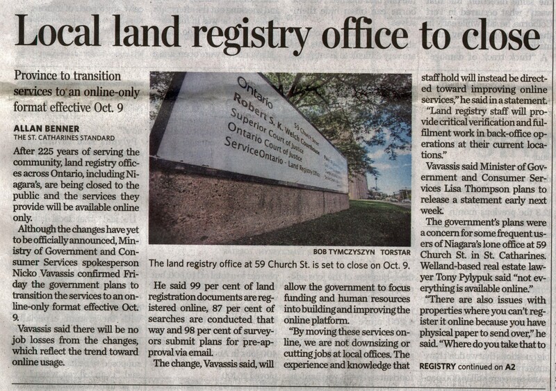 - Local land registry office to close : Province to transition services to an on-line only format effective Oct. 9