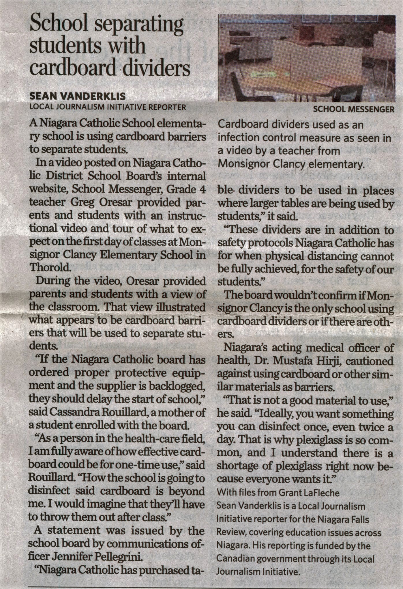 - Niagara Catholic District School Board / Hirji, Mustafa Dr. / cardboard dividers / safety protocols / COVID-19 pandemic