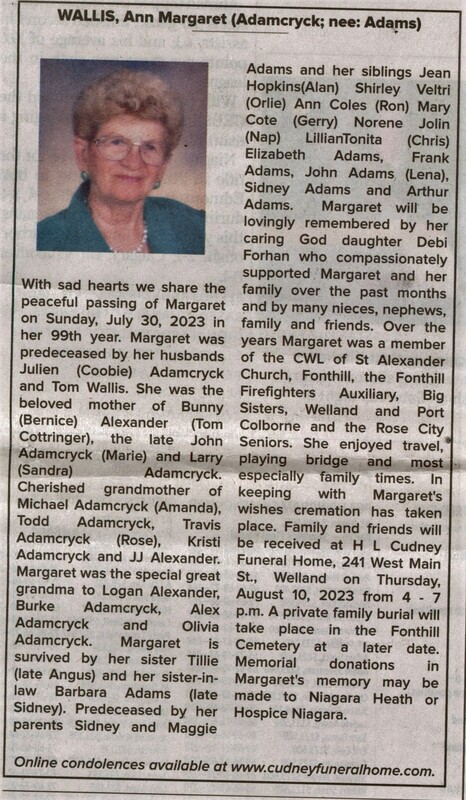 - Wallis, Ann Margaret (Adamcryck) (nee Adams)