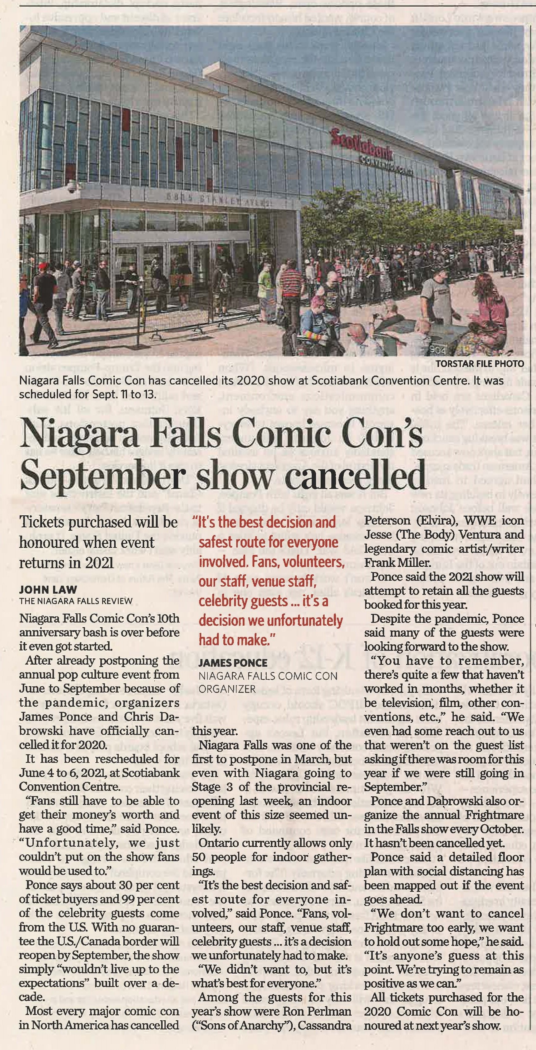 - Niagara Falls Comic Con's September show cancelled : tickets purchased will be honoured when event returns in 2021