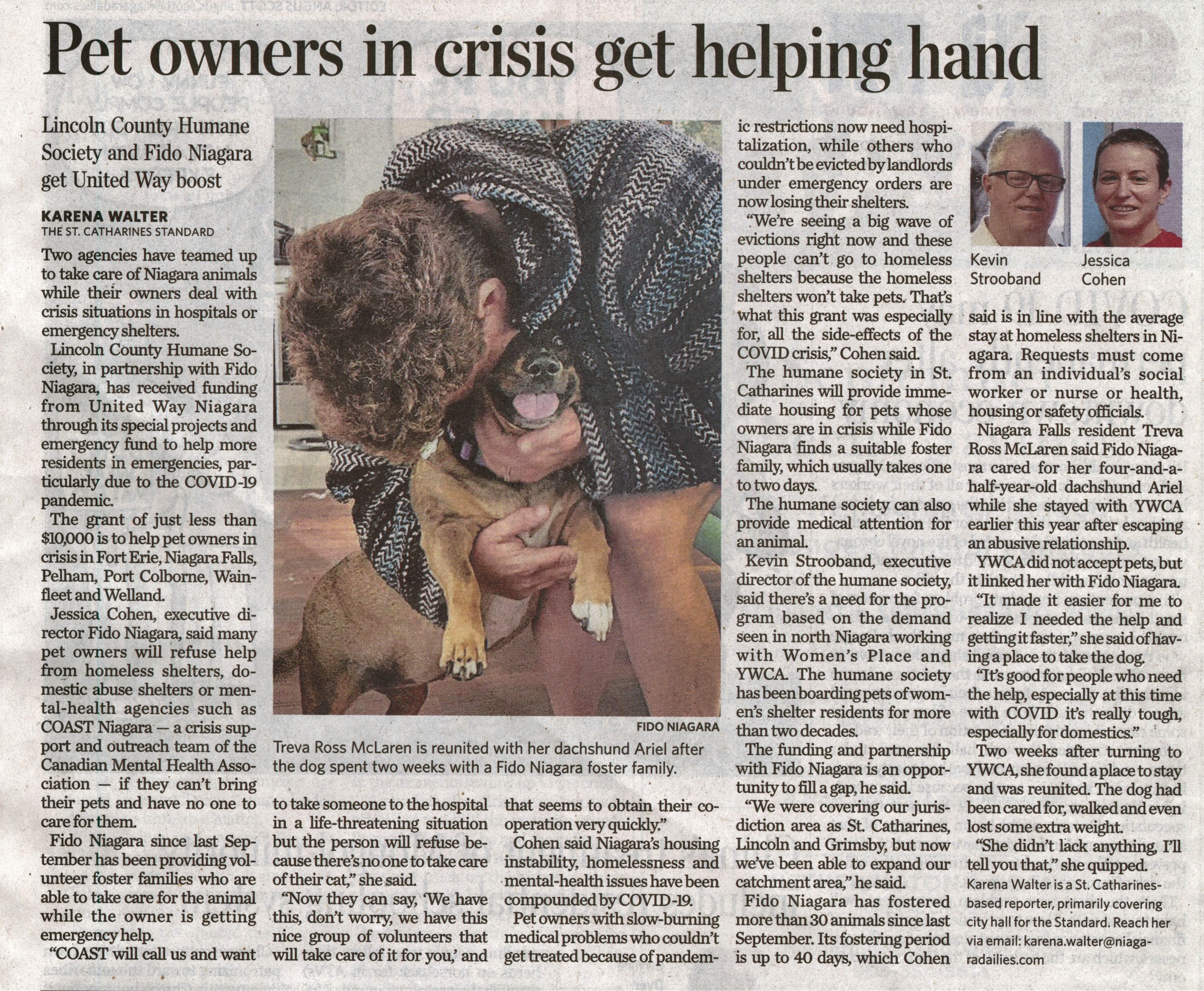 - Pet owners in crisis get helping hand : Lincoln County Humane Society and Fido Niagara get United Way boost.