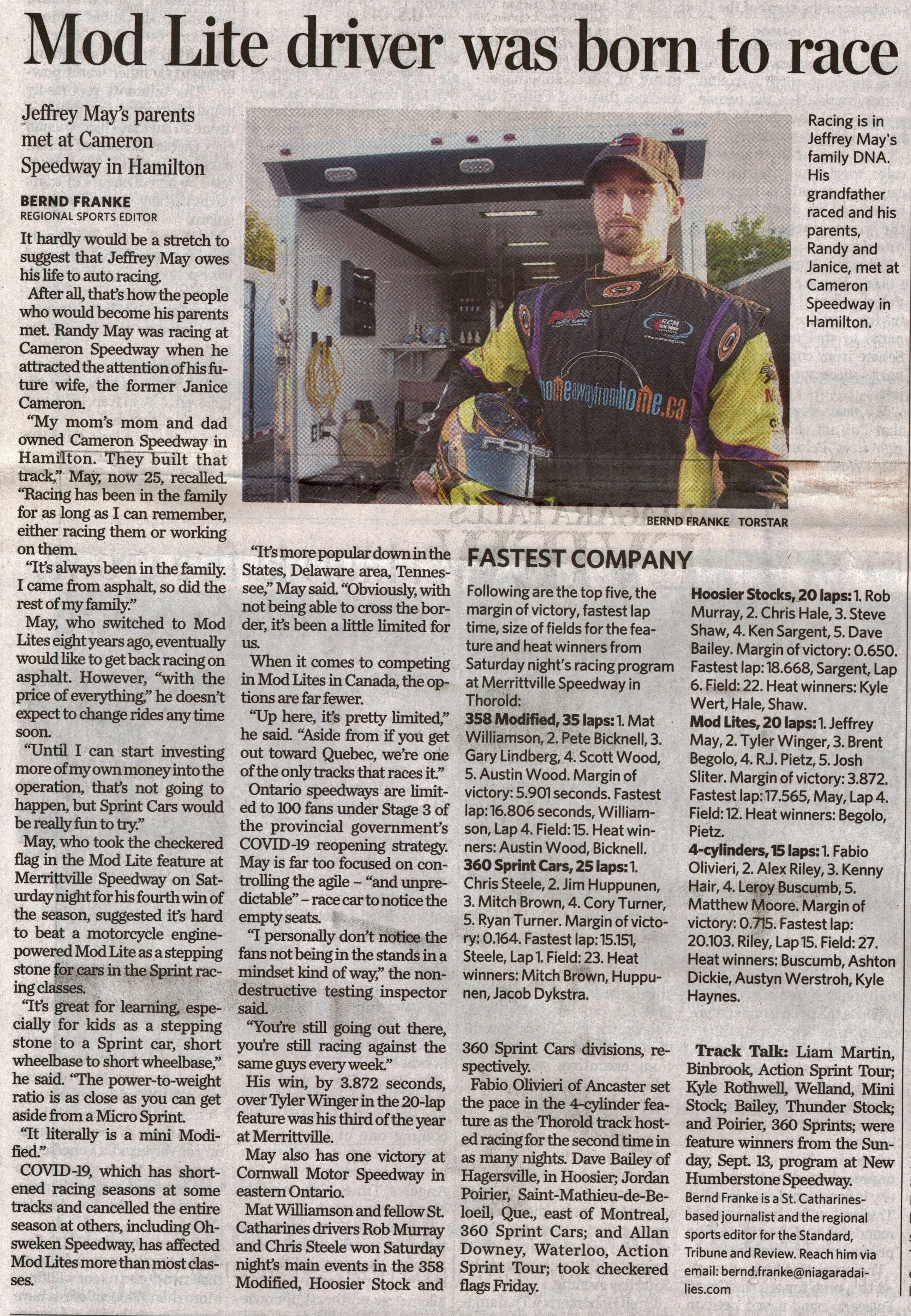 - Mod Lite driver was born to race : Jeffrey May's parents met at Cameron Speedway in Hamilton