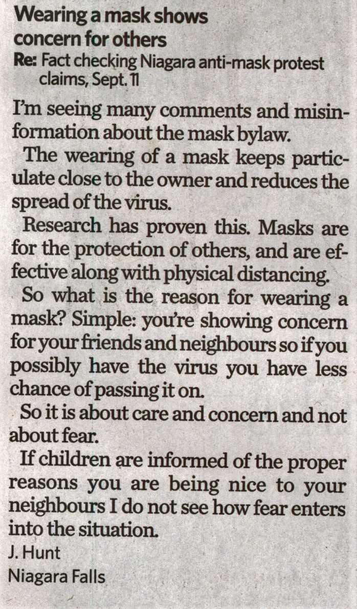 - Wearing a mask shows concern for others : Re: Fact checking Niagara anti-mask protest claims, Sept 11