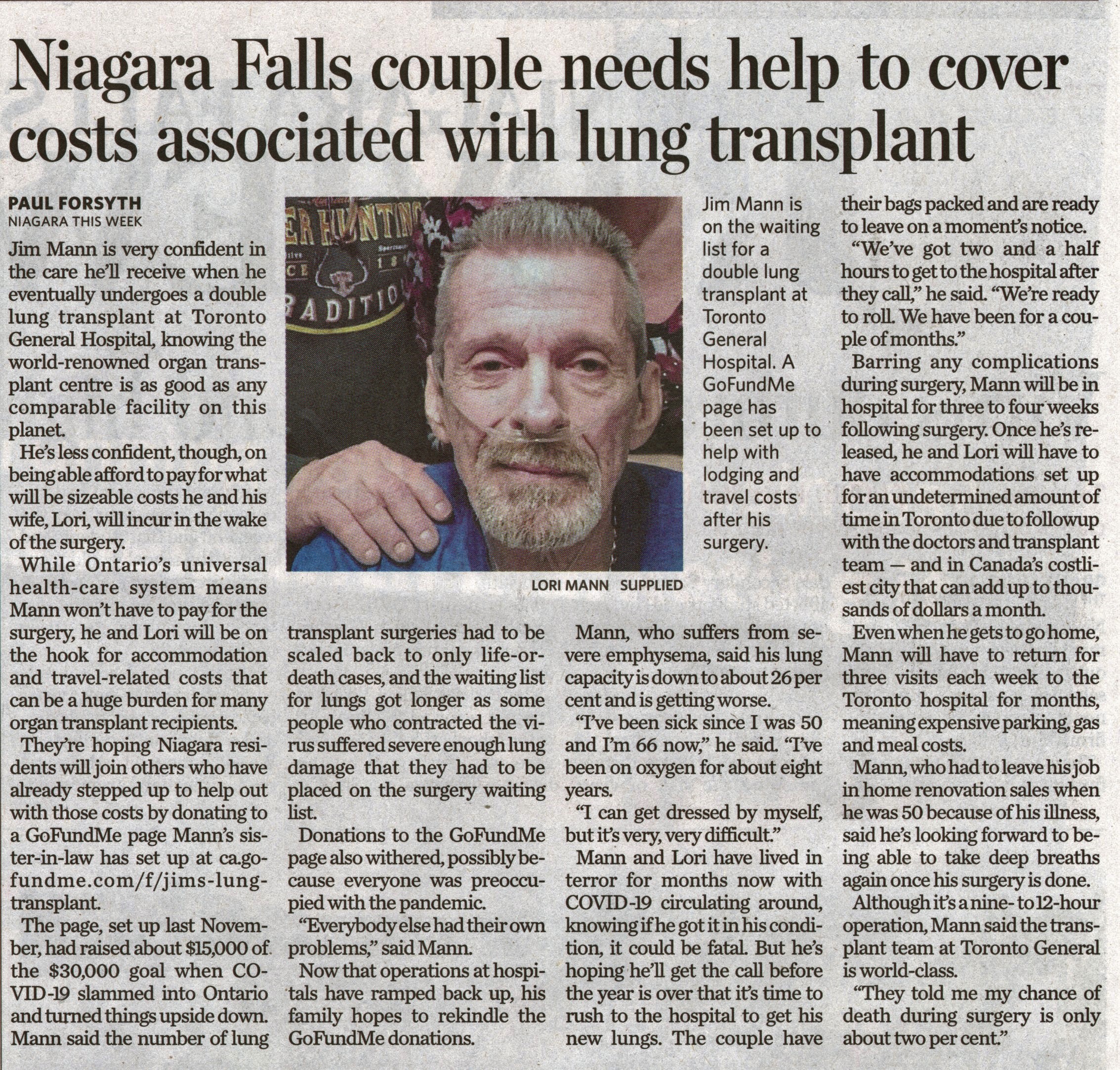 - Mann, Jim / lung transplant / Toronto General Hospital / GoFundMe campaign / COVID-19 pandemic
