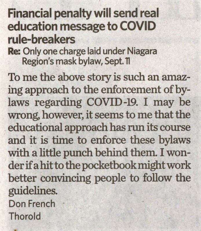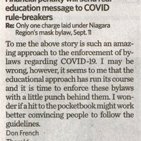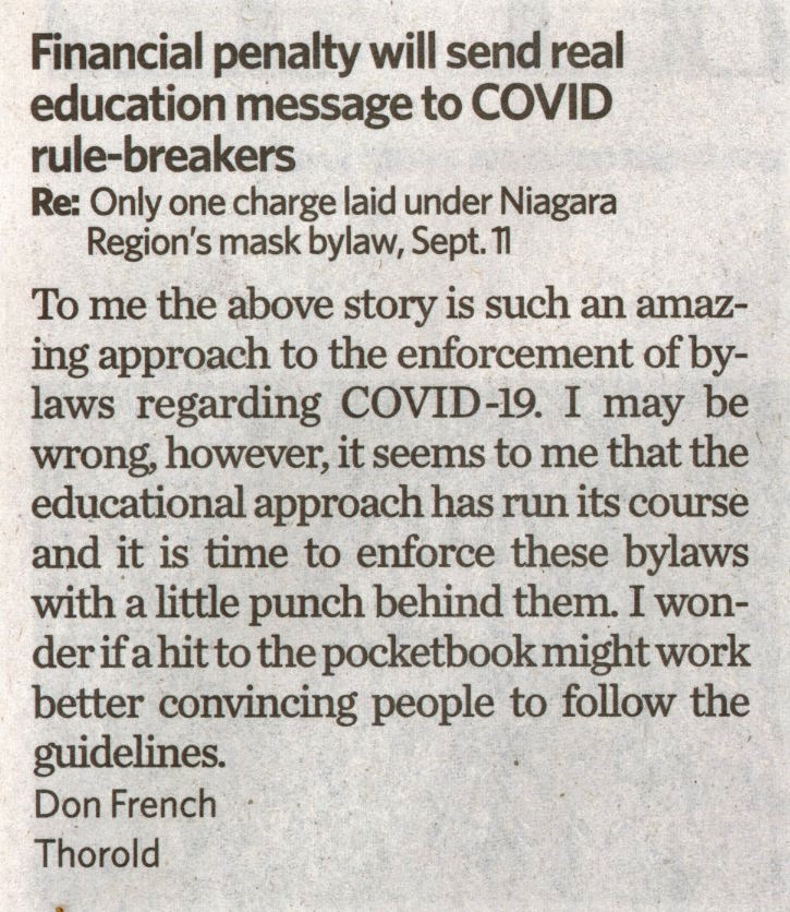 - Financial penalty will send real education message to COVID rule-breakers : Re: Only one charge laid under Niagara Region's mask bylaw , Sept 11