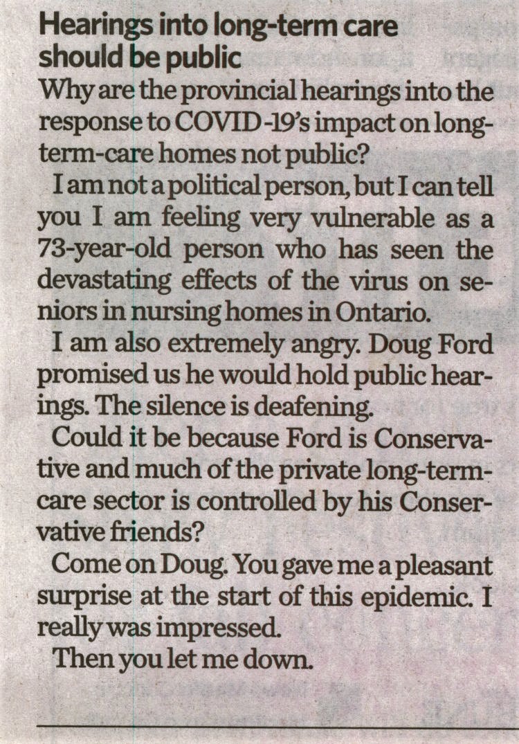 - COVID-19 pandemic / Impact on long-term-care homes / hold public hearings / Ford, Doug