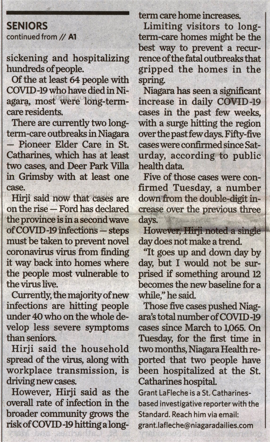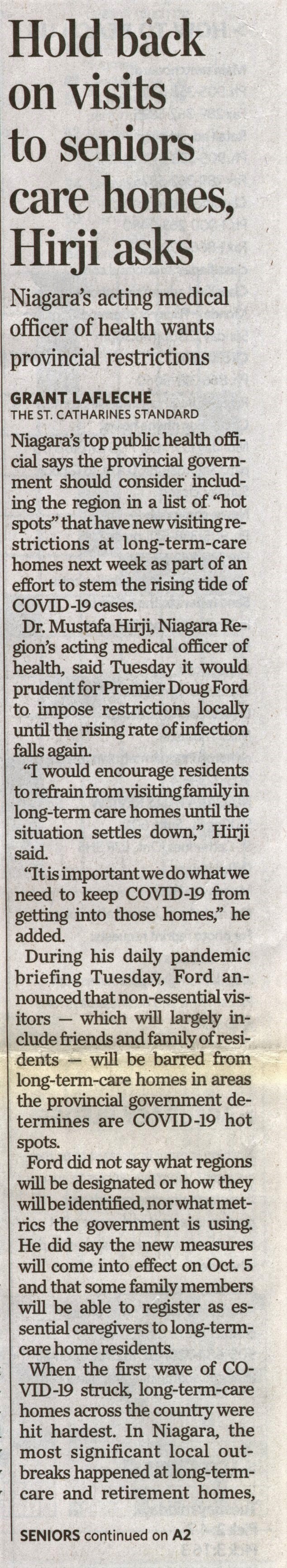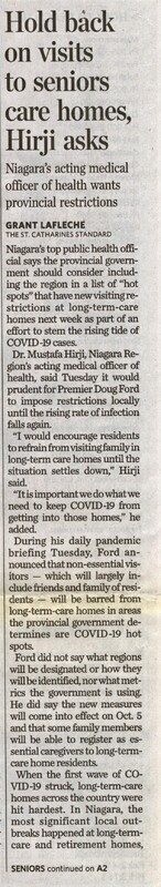 - Hold back on visits to seniors care homes, Hirji asks : Niagara's acting medical officer of health wants provincial restrictions