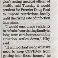 - Hirji, Mustafa Dr. / COVID-19 pandemic / long-term-care facilities / limit visits / outbreaks
