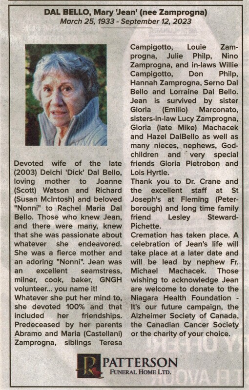 Dal Bello, Mary (Jean) (nee Zamprogna)