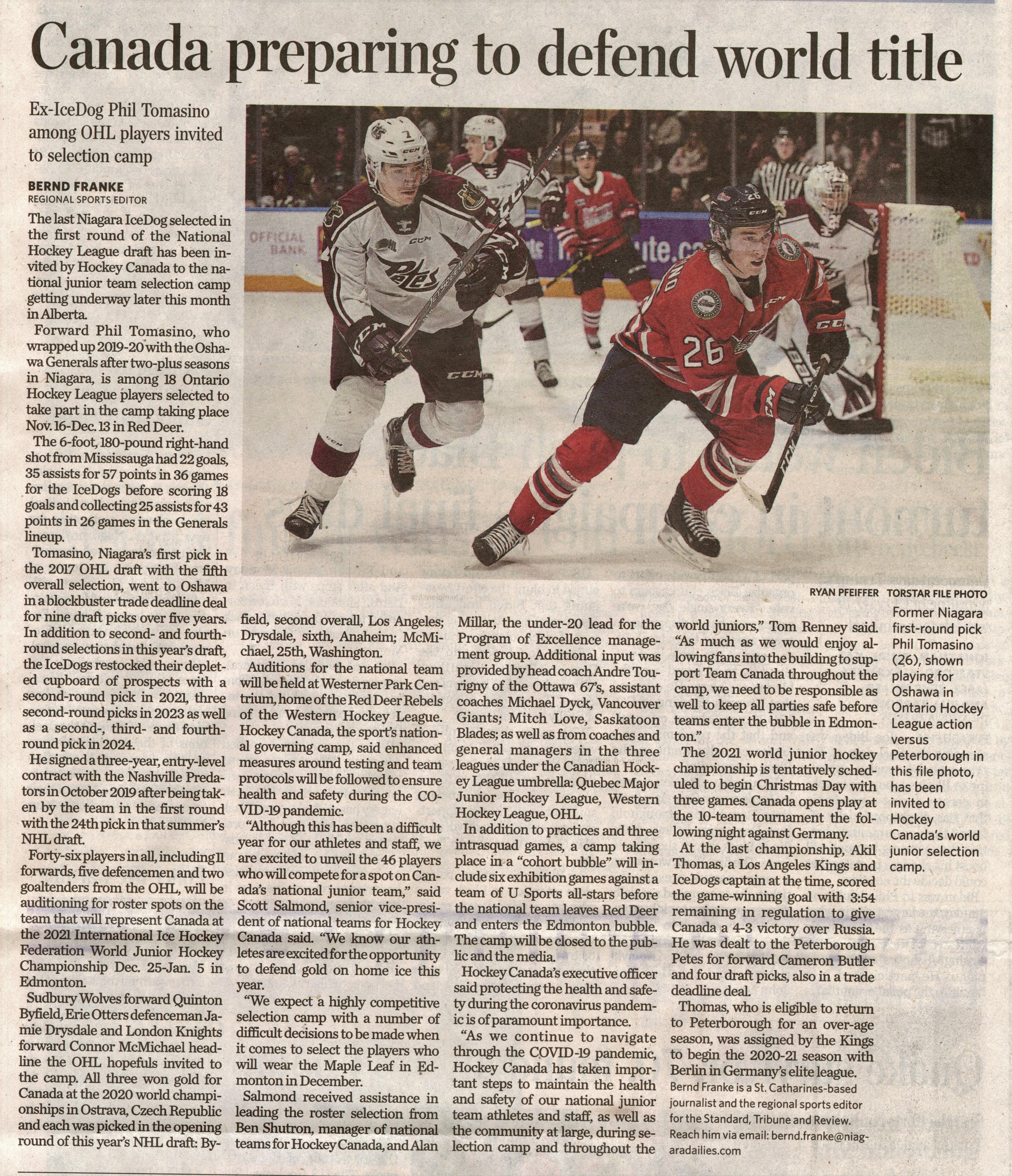 - Canada preparing to defend world title : Ex-IceDog Phil Tomasino among OHL players invited to selection camp
