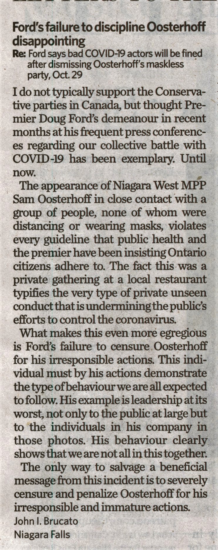 - Ford's failure to discipline Oosterhoff disappointing : Re: Ford says bad COVID-19 actors will be fined after dismissing Oosterhoff's maskless party, Oct. 29