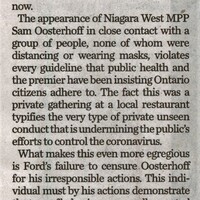 Ford's failure to discipline Oosterhoff disappointing : Re: Ford says bad COVID-19 actors will be fined after dismissing Oosterhoff's maskless party, Oct. 29