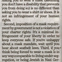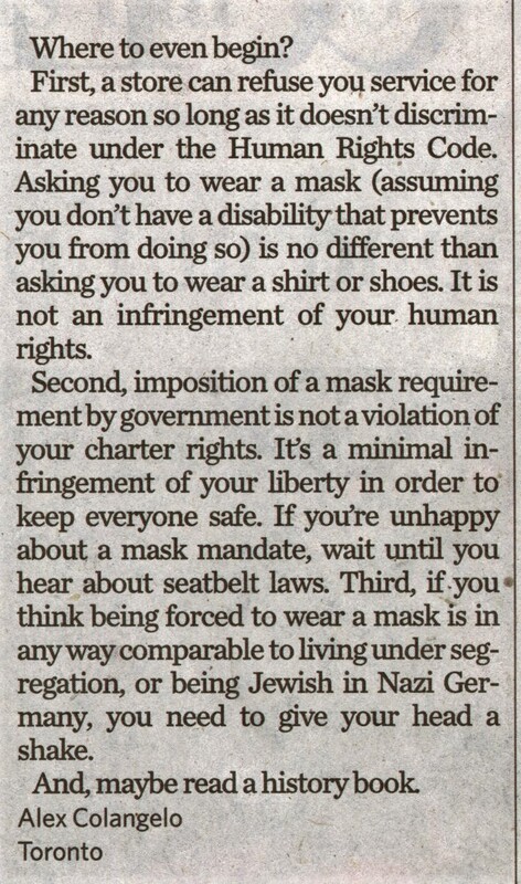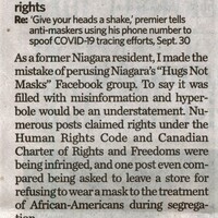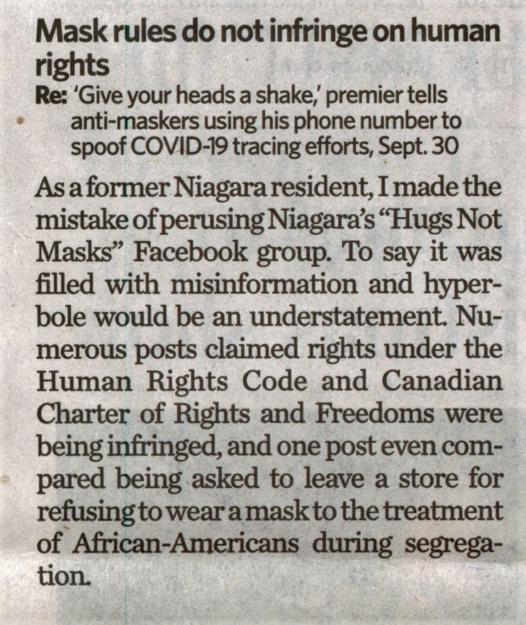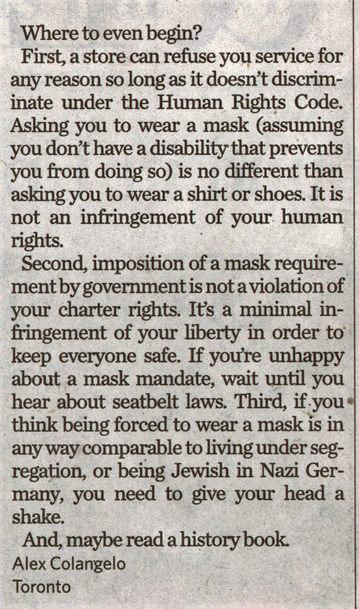 Mask rules do not infringe on human rights Re: 'Give your heads a shake,' premier tells anti-maskers using his phone number to spoof COVID-19 tracing efforts, Sept. 30